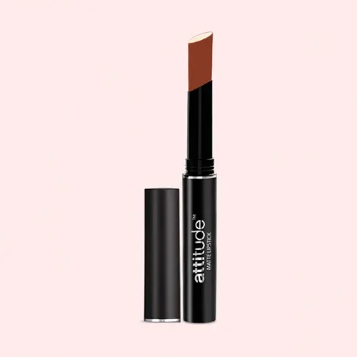Apply the Attitude Matte Lipstick Caramel Toffee to the center of your upper lip and move outwards towards the corners. Glide it across the entire bottom lip and purse your lips together for a smooth finish.