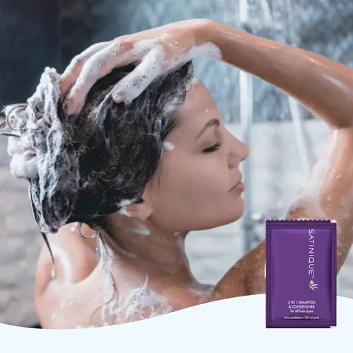 - Take an adequate amount of the SATINIQUE? shampoo and conditioner onto your palm. Gently apply it to wet hair and massage the scalp.