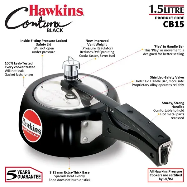 Hawkins 1.5 Litre Contura Black Pressure Cooker, Hard Anodised Inner Lid Cooker, Baby Cooker, Black(CB15)