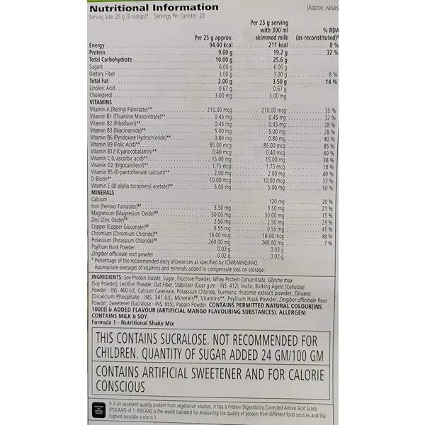 - 3 scoop of formula one with protein in 250 ml cool milk. prepare shake and take 2-3 time in a day.