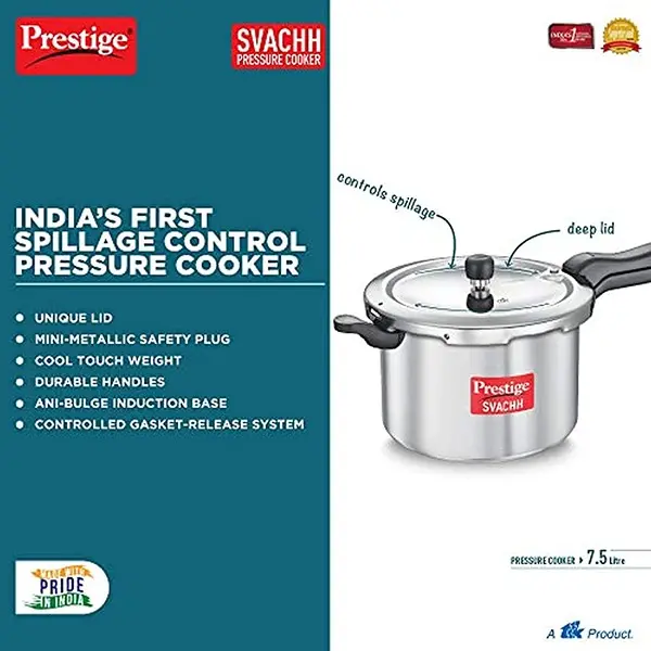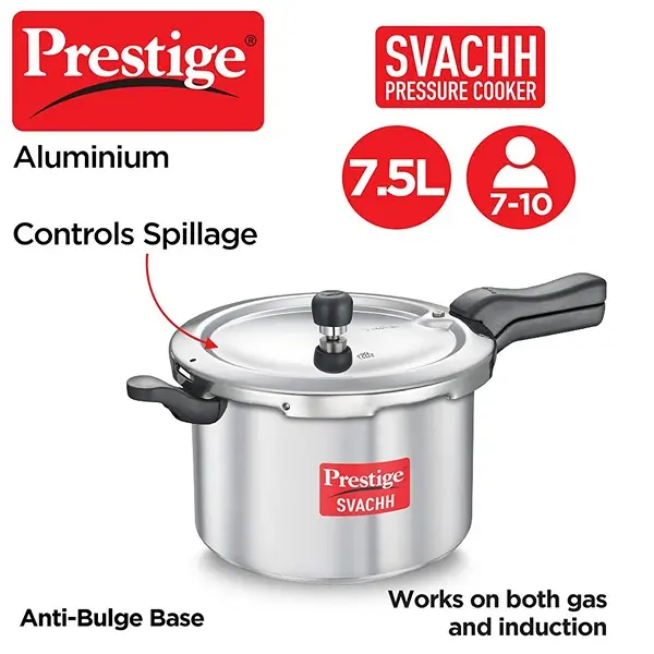? Package Contents: 1 x Prestige Svachh, 10727, 7.5 L, Svachh Aluminium Pressure Cooker, with deep lid for Spillage Control