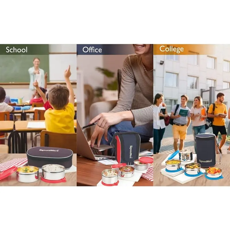 ? Ideal for office executives and school going kids ; Ideal Usage: School, Office ; Unique insulated bag keeps food warm for hours, Non-cracking, superior quality stainless steel