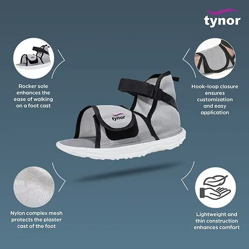 Tynor Cast Shoe ( Rocker sole) replaces the functions of the normal shoe when patient is on foot cast. Prevents excessive wear & tear of the cast and reduces impact on the injured leg. It ensures high degree of hygiene and improves gait of the patient on foot cast. The design ensures easy wearing and removal.